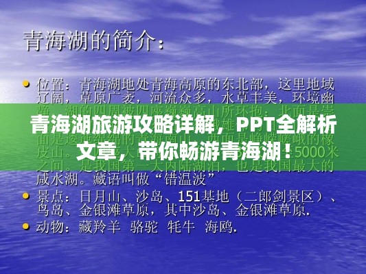 青海湖,这颗镶嵌在青藏高原的璀璨明珠,每年都吸引着成千上万的游客前来探访,为了让您的青海湖之行更加精彩,我们为您精心策划了这篇青海湖旅游攻略PPT文章。
