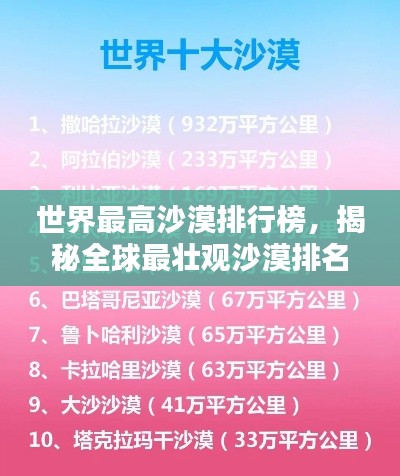 沙漠,是指地面完全被沙所覆盖、植物非常稀少、雨水稀少、空气干燥的地理区域,虽然沙漠地带往往与荒凉、干旱等词汇联系在一起,但它们也有其独特的美丽,让我们来探讨一下世界最高的沙漠排名。