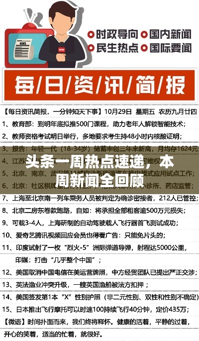 本周头条新闻涵盖了科技、经济、疫情防控、社会热点、娱乐和体育等多个领域,随着全球经济的复苏和科技的快速发展,各领域都取得了重要进展,公众关注的焦点也在不断变化,从环保、教育到娱乐体育等领域都有引人关注的新闻,展望未来,我们将继续关注全球范围内的重大事件和热点话题,为公众提供及时、全面的新闻报道。