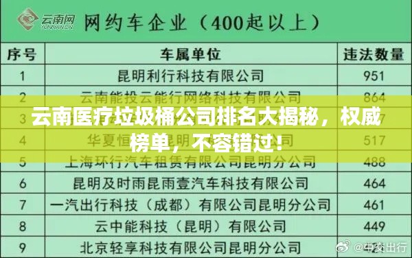 随着医疗行业的快速发展,医疗垃圾桶的需求也日益增长,云南地区作为医疗事业蓬勃发展的地区之一,其医疗垃圾桶市场亦呈现出蓬勃生机,本文将为您介绍云南地区医疗垃圾桶公司的排名,以便您了解该领域的市场格局及主要参与者。