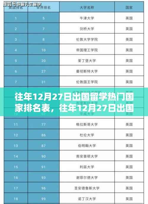 随着全球化进程的加速,出国留学已成为越来越多学子追求高质量教育和人生发展的选择,每年的年末,特别是在临近圣诞节和新年的时节,不少学生和家长开始关注次年留学的热门目的地,本文将结合往年数据,特别是以12月27日的时间点为参考,对出国留学热门国家进行排名分析,旨在为即将踏上留学征途的学子们提供有价值的参考信息。