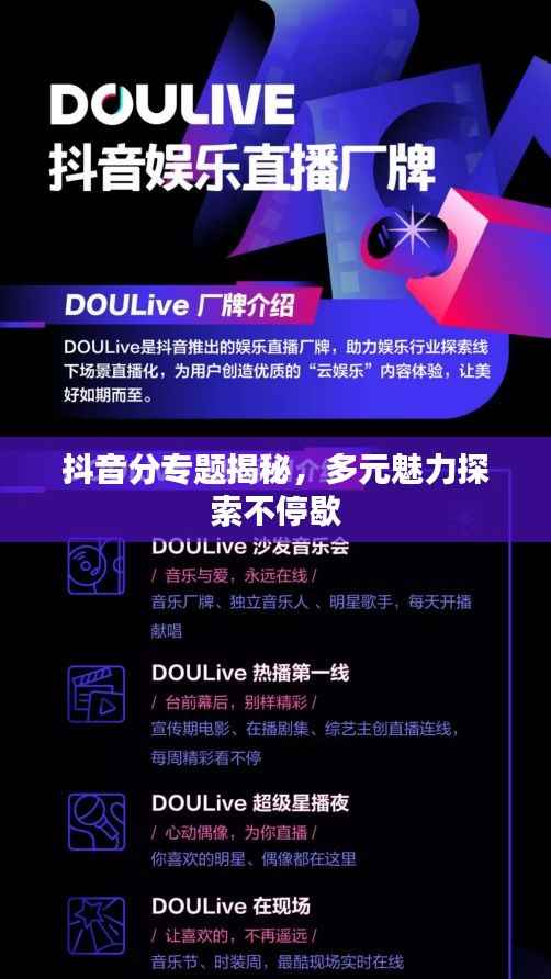 抖音作为一个领先的短视频社交平台,其丰富的专题内容为用户提供了无限的可能,无论是娱乐、美食、旅行、教育还是艺术,都能在抖音找到属于自己的板块,通过关注和互动,用户可以参与到这个多元的世界,感受到不同的文化和风情,希望本文能帮您更深入地了解抖音的多元魅力,也期待您在抖音的世界里发现更多的精彩。